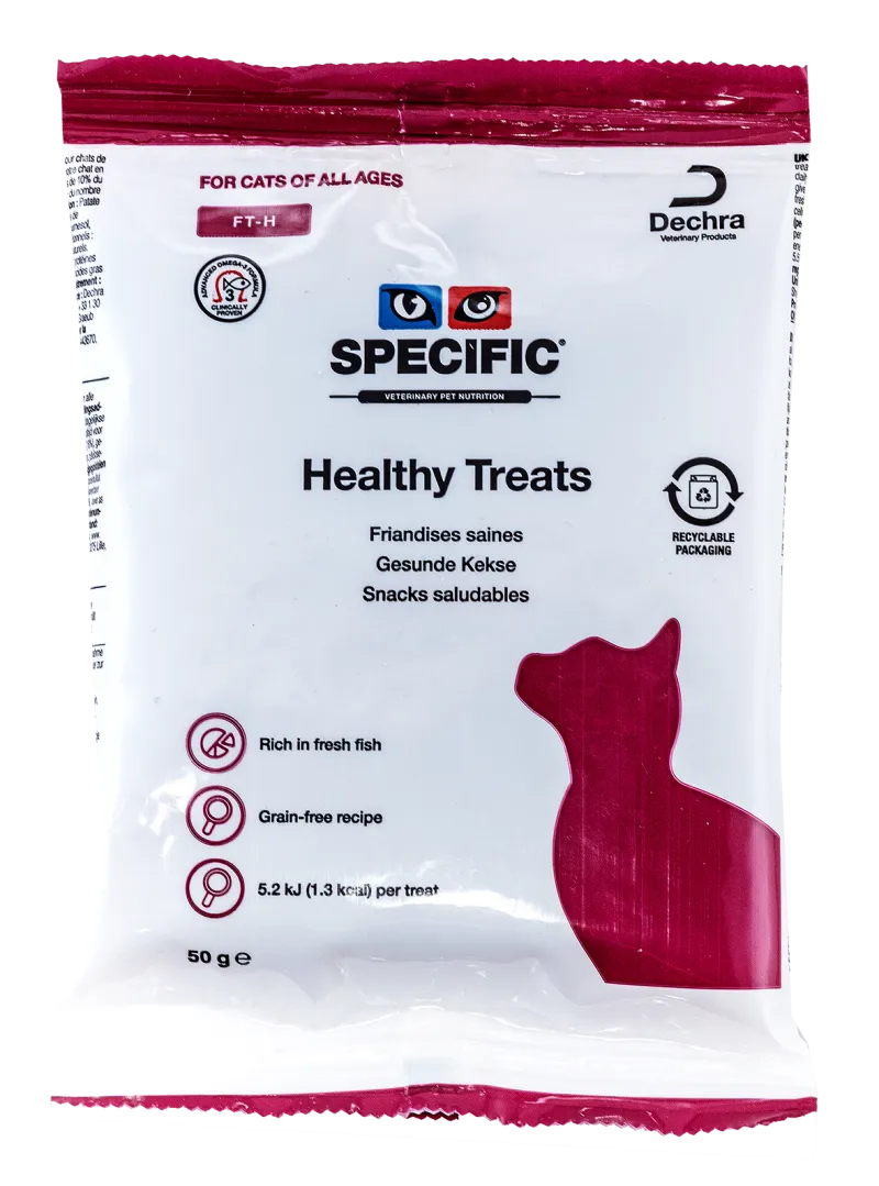 SPECIFIC FT-H Healthy Treats – sveiki skanėstai visų veislių ir įvairaus amžiaus katėms. Skanėstai gali būti naudojami kaip papildomas pašaras prie skirtos dietos arba katės skatinimui.