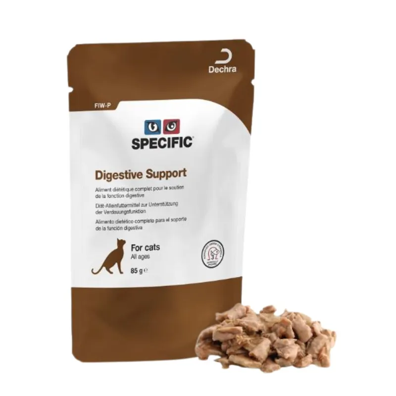 SPECIFIC® Digestive Support visavertis, subalansuotas, konservuotas, dietinis pašaras katėms, skirtas sumažinti (ūmius) žarnyno absorbcijos sutrikimus, padėti atsiradus ėdesio sutrikimams ir/ar egzokrininiam kasos nepakankamumui. Pašaras yra itin gerai virškinamas ir turi padidintus natrio ir kalio kiekius. Šis visavertis, dietinis pašaras skirtas pilnai tenkinti kasdienius kačių poreikius, palaikyti gerą augintinio sveikatą.